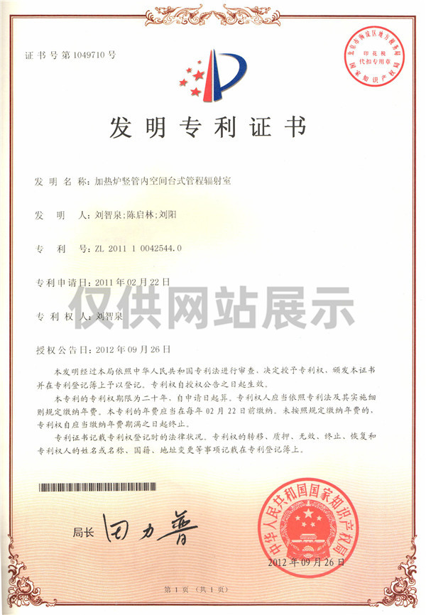 加熱爐豎管內(nèi)空間臺式管程輻射室